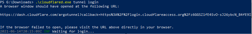 Now that we know the tunnel works, we can set one up properly. To to this, we need to log into cloudflare to provide the cloudflared client with credentials. s