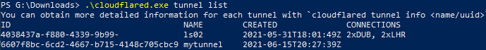 As you can see here, mytunnel has been created and has no connections currently. You can also see the status of any other tunnels e.g. ls02 shown here is currently connected to Cloudflares LHR (London Heathrow) and Dublin datacenters twice. Cloudflare tunnels automatically set up redundant connections to provide automatic load balancing and failover between Cloudflare endpoints, handy!