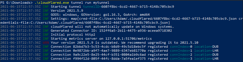 The tunnel is now up and running, with 4 connections to cloudflare, great!