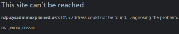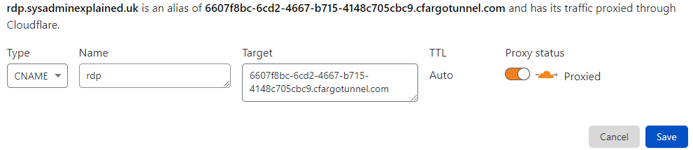 In this case, rdp.sysadminexplained.uk will direct to 6607f8bc-6cd2-4667-b715-4148c705cbc9.cfargotunnel.com which is the mytunnel cloudflared tunnel. Make sure to leave proxying enabled!