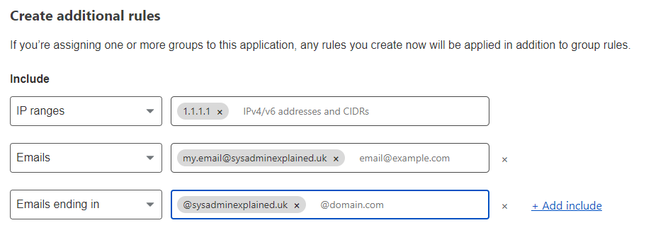 This part is entirely up to you, the above example shows you some ideas for giving access based on specific IPs, emails or domains. Just note that if you want to allow certain IP addresses in, you must set the rule action to bypass which will skip authentication fully for those IP addresses.